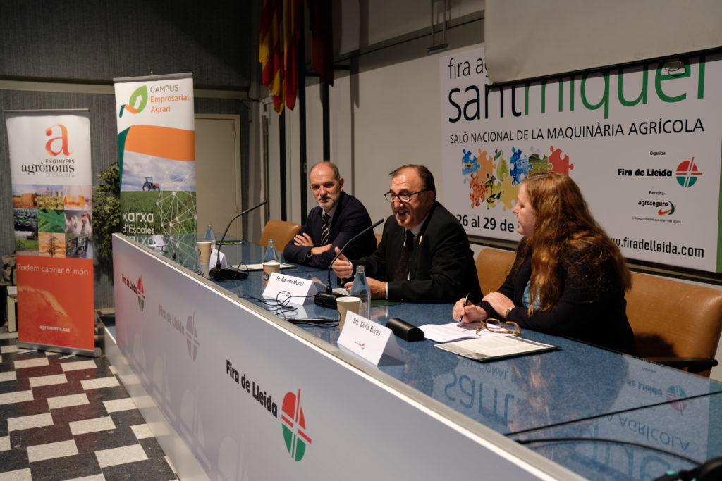 La presentació de la jornada “Agricultura 4.0: necessitats i possibilitats”, amb una massiva assistència de públic, ha anat a càrrec del director general d’Alimentació, Qualitat i Indústries Agroalimentàries, Carmel Mòdol; de la degana del Col·legi Oficial d’Enginyers Agrònoms de Catalunya, Sílvia Burés; i del director general de Fira de Lleida, Oriol Oró.